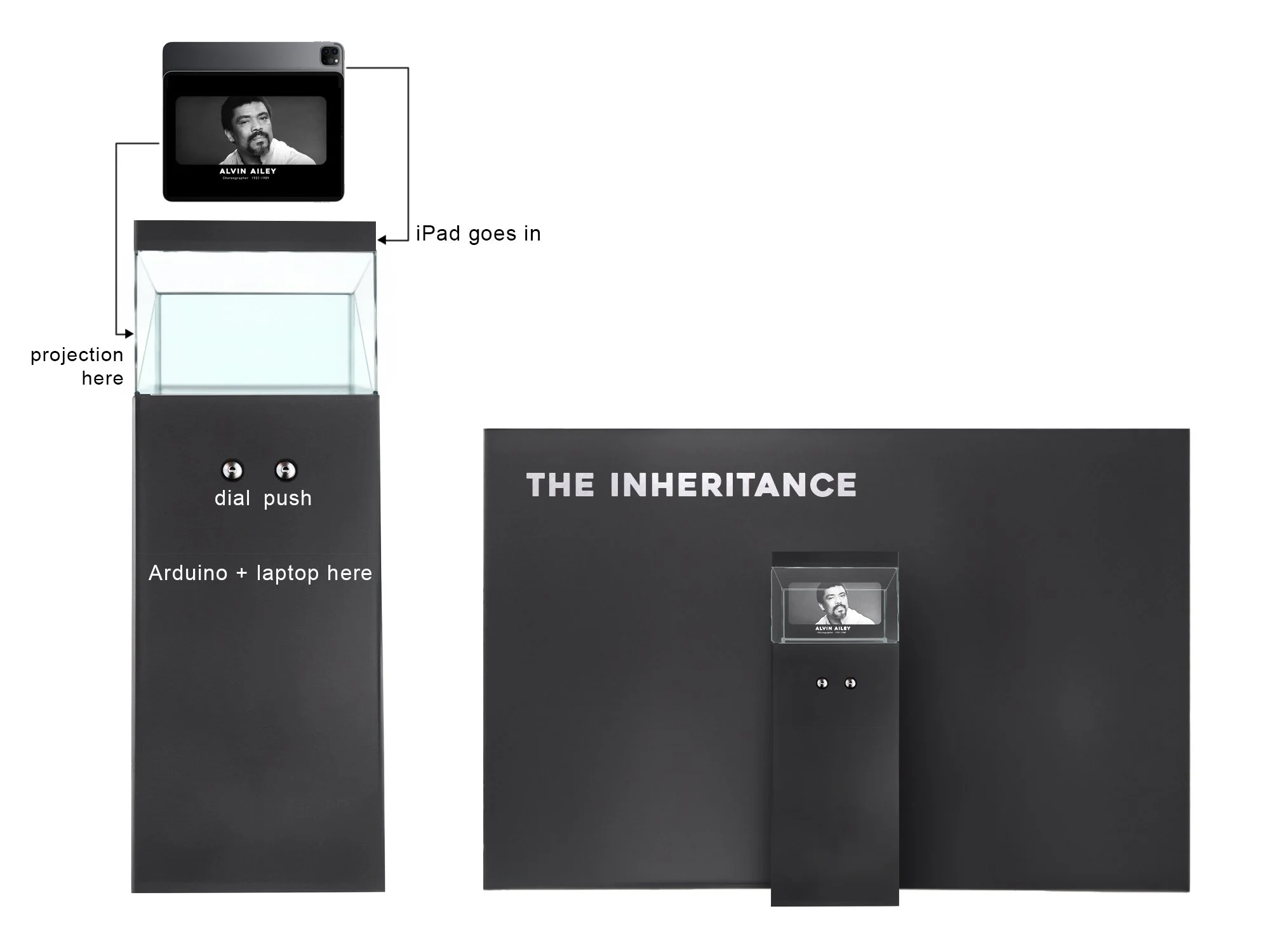 The main display is using pepper’s ghost to project a hologram inside the display case, there will be one rotary encoder (dial) and one button on the pedestal connected to an Arduino. The Arduino is connected to a laptop, which will be screen mirroring into an iPad. The ipad and a thin acrylic piece will do the trick of light to show the hologram. The hologram content is a video, the video is controlled by and run on p5js. The dial and the button will send data to the serial port to be processed by p5, and that’s how we control the video display with the arduino.